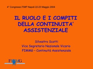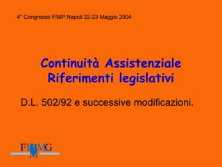 Il 4° congresso FIMP di Napoli del maggio 2004 ha trattato il ruolo della continuità assistenziale, evidenziando la necessità di coordinamento tra diversi servizi sanitari e la presenza di medici di continuità assistenziale. Sono emerse proposte per la creazione di strutture filtro nei pronto soccorso pediatrici per migliorare la gestione delle emergenze e una formazione specifica per medici di guardia medica. Il documento sottolinea l'importanza dell'associazionismo tra pediatri e l'ottimizzazione delle risorse per rispondere adeguatamente alle esigenze sanitarie della popolazione infantile.