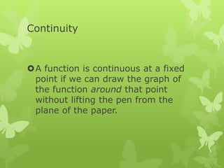 The document discusses key concepts in calculus including continuity, differentiation, integration, and their applications. It defines continuity as being able to draw a function's graph without lifting the pen, and differentiation as computing the rate of change of a dependent variable with respect to changes in the independent variable. The document also covers differentiation rules and techniques for implicit, inverse, exponential, logarithmic, and parametric functions.