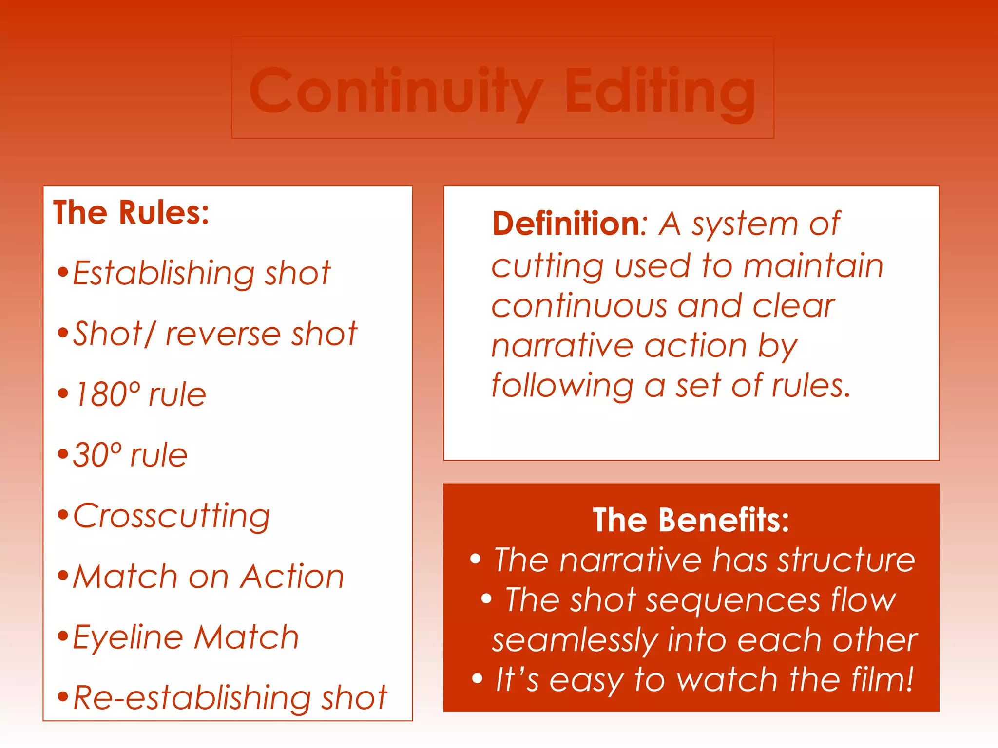 This document defines and discusses the techniques of continuity editing in filmmaking. It explains that continuity editing uses rules like the 180-degree rule, 30-degree rule, shot/reverse-shot, matching action, and re-establishing shots to maintain a clear and seamless narrative. Following these rules helps the viewer easily understand the spatial relationships between characters and objects in a scene. The document provides examples and explanations of how to implement several of the basic continuity editing techniques.