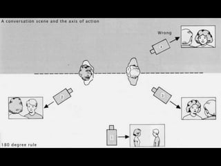 This document discusses continuity editing techniques in film including establishing shots, two-shots, over-the-shoulder shots, close ups, eyeline matching, the 180-degree line, and crossing the 180-degree line. It provides examples from the films Notorious, Road to Perdition, and His Girl Friday to illustrate how continuity editing creates a sense of spatial and temporal continuity for viewers.