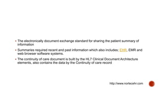 The Continuity of Care Document (CCD) enables physicians to share patient medical information securely while adhering to standardized electronic formats established by HL7. It facilitates the flow of essential demographic, administrative, and clinical data among healthcare providers to ensure comprehensive and seamless patient care. Notably, the CCD is designed to be human-readable and incorporates recent and historical patient data, allowing for easier management and access by both providers and patients.