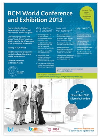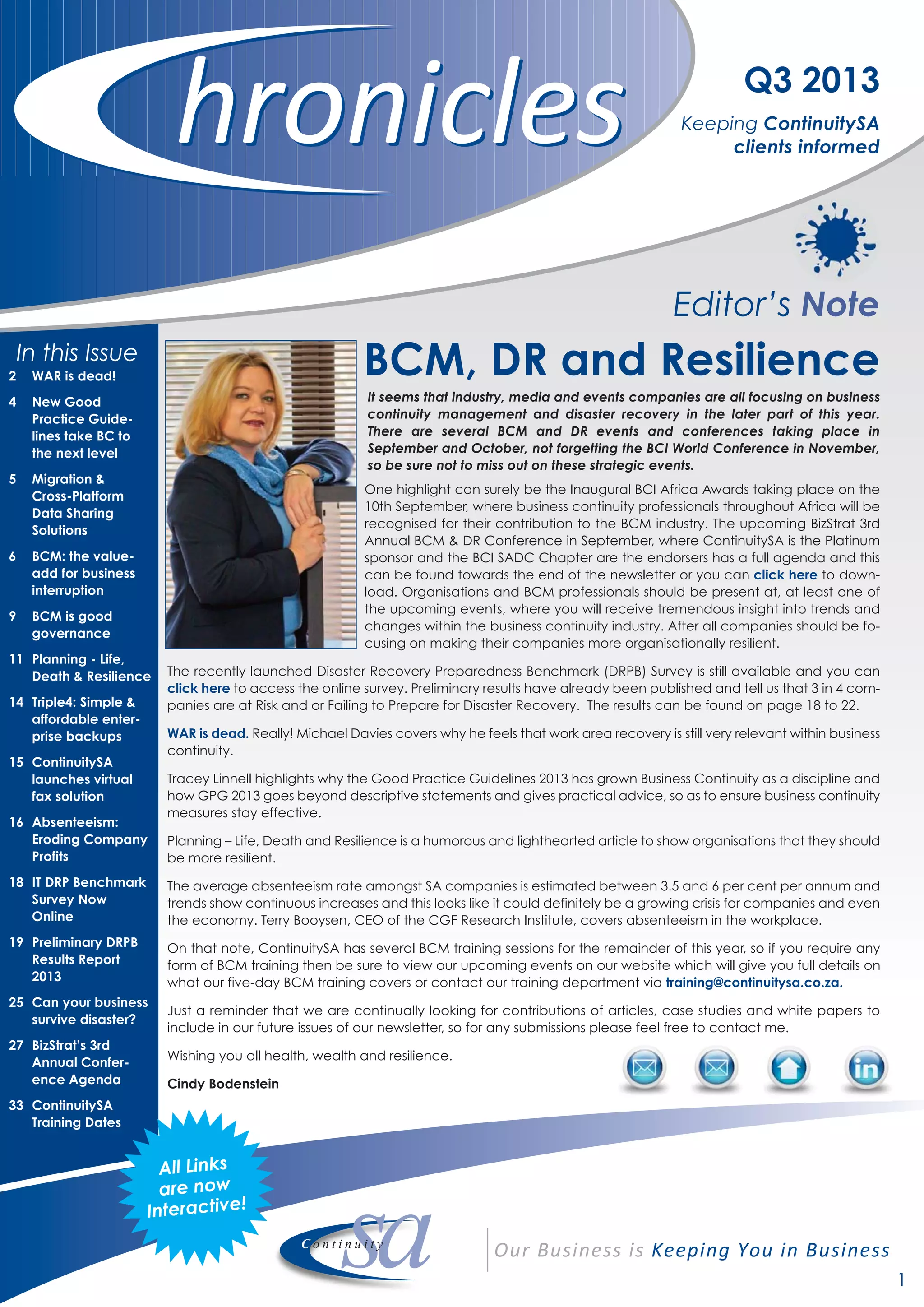 It seems that industry, media and events companies are all focusing on business continuity management and disaster recovery in the later part of this year. There are several BCM and DR events and conferences taking place in September and October, not forgetting the BCI World Conference in November, so be sure not to miss out on these strategic events. The document discusses various topics related to business continuity management including work area recovery, new good practice guidelines, migration and data sharing solutions, the value of BCM for business interruption, absenteeism in the workplace, and upcoming ContinuitySA training dates.