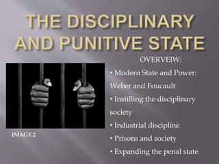 This document provides an overview of several topics related to modern state power and social control, democracy and citizenship, and inequality. It begins with a discussion of Weber and Foucault's theories on the modern disciplinary state and the use of institutions like prisons, schools, and factories to instill social control and discipline. It then examines debates around democracy, citizenship, and inequality, referencing theorists like Marshall, Kristol, Piketty and others. Throughout it includes images to illustrate key concepts and quotes to highlight important arguments from theorists.