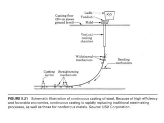 Continuous casting was conceived in the 1860s and has since led to major improvements in efficiency, productivity, and cost reductions for metal production. The process involves cleaning and equalizing molten metal in a ladle before pouring it into a tundish where impurities are removed, then the metal travels through water cooled copper molds to begin solidifying as it moves downward along supported rollers. The key advantages are 100% casting yield due to no waste metal, an automatic and consistent process, and reproducible mechanical properties.