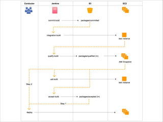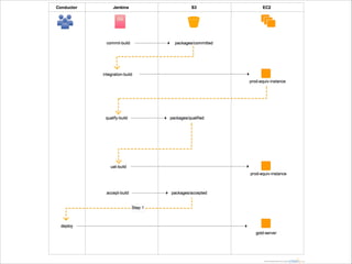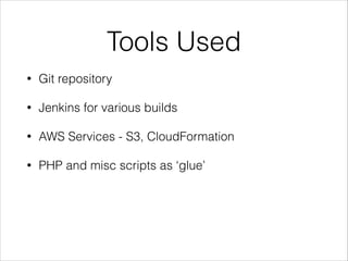 The document proposes a new continuous delivery workflow using Git for version control, Jenkins for builds, AWS services like S3 and CloudFormation, and scripts to integrate tools. It notes current problems like unclear test and deployment processes, configuration issues, and ad-hoc deployments. The workflow would separate custom app code into a new repository, consolidate configurations, and establish disciplined environment setups and deployments.