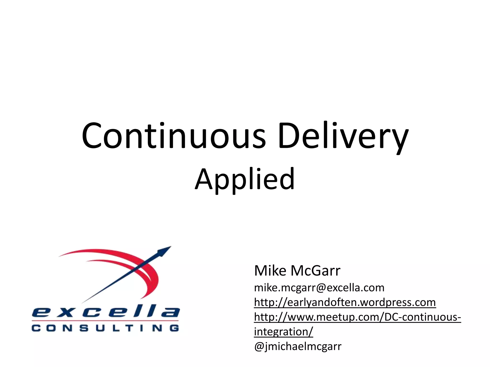 This document discusses continuous delivery, which aims to build, test, and release software faster through frequent integration and deployment. The goals are quality, speed, and reducing the time it takes to deploy changes from development to production through practices like test-driven development, continuous integration, automated testing, and deployment pipelines. It provides an overview of tools to support continuous delivery processes.