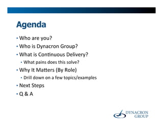 The document discusses Continuous Delivery (CD) as a set of principles and practices aimed at improving the software delivery process, highlighting its benefits like faster deployment and reduced manual overhead. It outlines the current challenges faced in software releases, including painful releases and environment management issues, and contrasts this with the targeted state of automated, efficient processes. The document concludes by proposing starting points for implementing CD, including platform modernization and the importance of training and tool recommendations.
