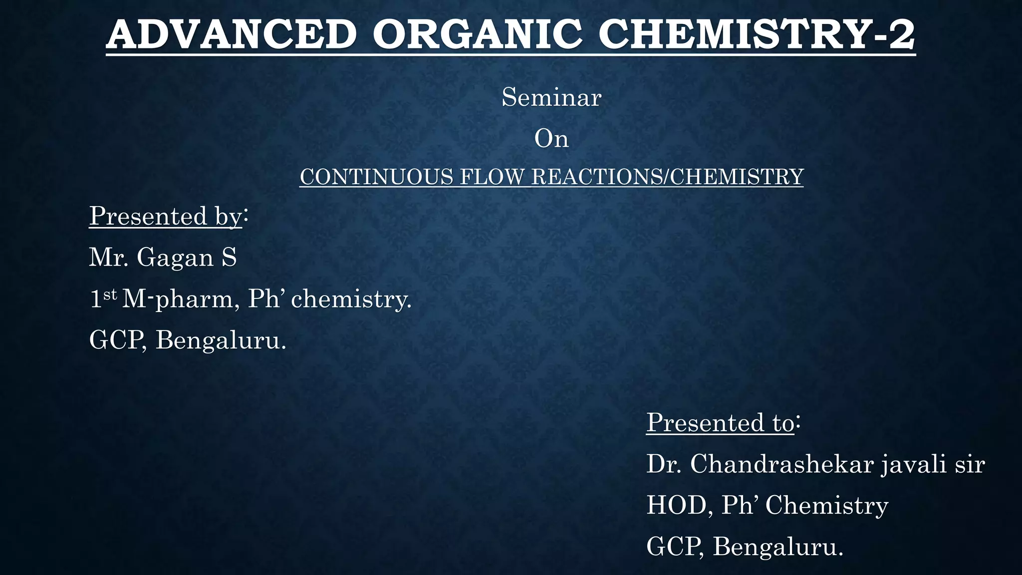 This document presents an advanced seminar on continuous flow reactions, highlighting the differences between batch and flow chemistry, including their advantages and disadvantages. Continuous flow techniques streamline multi-step syntheses by combining reactions without the need for isolating intermediates, offering improved efficiency for producing complex compounds. Various types of reactors and their specific applications, as well as notable synthetic examples such as the synthesis of ibuprofen, are discussed.
