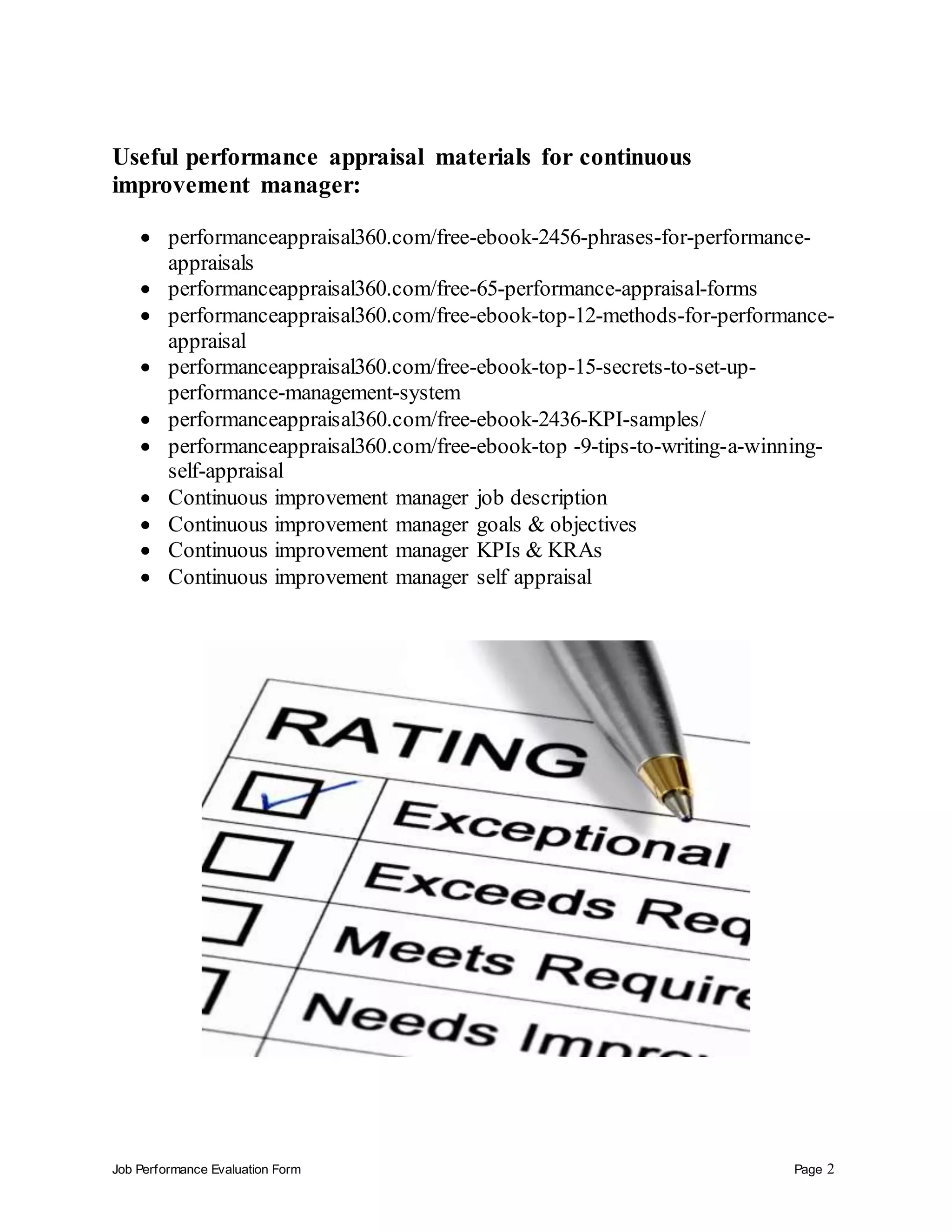 This document provides information on performance evaluation methods for continuous improvement managers. It discusses 12 different methods: management by objectives, critical incident method, behaviorally anchored rating scales, behavioral observation scales, 360 degree appraisal, and checklist and weighted checklist method. For each method, it provides a definition and overview, as well as advantages and disadvantages. The goal is to help evaluate a continuous improvement manager's performance and identify areas for improvement.