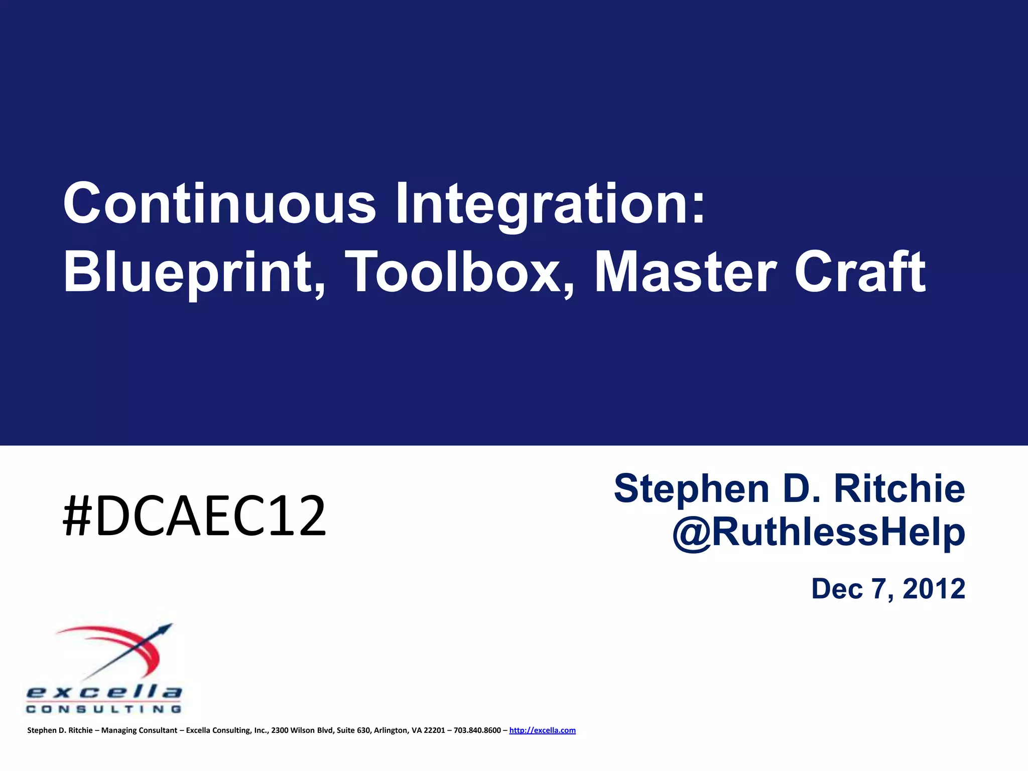 The document discusses continuous integration, describing it as a blueprint and toolbox for master craftspeople. It defines continuous integration as automatically building and testing code changes frequently on a centralized server. This catches issues early by running unit tests, code analysis, and other checks on every commit. The document recommends tools like Jenkins, CruiseControl, and TeamCity for implementing continuous integration and emphasizes practices like unit testing with coverage, code quality analysis, reporting, and deployment automation for a complete continuous integration system.