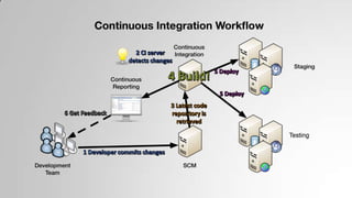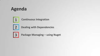 This document discusses continuous integration (CI), dealing with dependencies, and using Nuget for package management. It defines CI as merging code into a shared repository multiple times per day to detect errors quickly. Key CI practices include automating builds, tests, and deployments. Dependency management is important to avoid issues like conflicting dependencies. Nuget is a package manager that stores reusable code packages for Microsoft projects and manages dependencies through a manifest file.