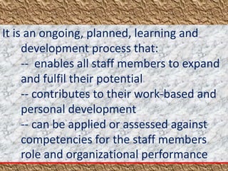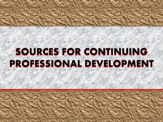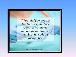 The document discusses continuing professional development (CPD) for nurses. It defines CPD as an ongoing process to maintain and improve knowledge and skills throughout a nurse's career. The objectives of CPD are to keep nurses updated in their field and increase their abilities. CPD is important to provide safe, effective patient care and meet changing needs. It benefits both individual nurses through career advancement and organizations by maximizing staff potential. The document outlines various methods of CPD including work-based learning, professional activities, formal education, self-directed learning, and overcoming potential barriers.