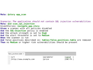 This document discusses integrating security testing into continuous delivery pipelines. It argues that security testing should be performed continuously and automated like other tests, rather than as a separate process. The document recommends that development, operations, and security teams work together in a "SecDevOps" model where security testing is integrated into regular testing workflows and everyone shares responsibility. It presents the BDD-Security framework as an example of how behavior-driven development can be used to automate continuous security testing that runs with each code change.