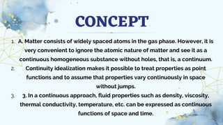 This document discusses the continuum model approach in modeling matter and fluid properties. It states that matter consists of widely spaced atoms but it is convenient to treat matter as a continuous substance without gaps. This continuum idealization allows properties to be expressed as continuous functions of space and time rather than considering the atomic nature. It allows treating properties as smooth point functions that vary continuously without jumps.