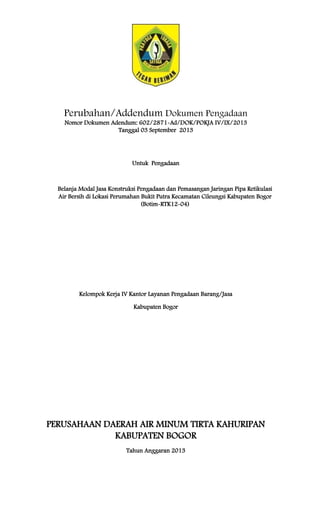 Dokumen ini berisi addendum terhadap pengadaan belanja modal jasa konstruksi pemasangan jaringan pipa retikulasi air bersih di perumahan Bukit Putra, Cileungsi, Kabupaten Bogor. Terdapat perubahan pada daftar personil inti yang mencakup posisi dan persyaratan pendidikan serta pengalaman. Addendum ditandatangani pada 3 September 2013 oleh panitia pengadaan.