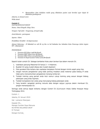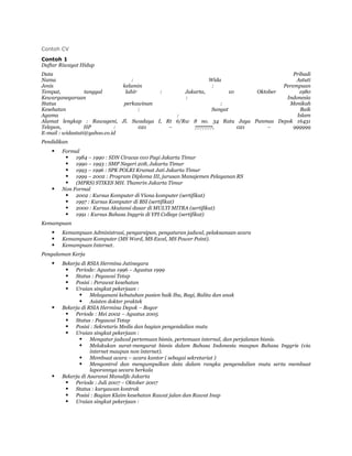 CV ini berisi data pribadi dan riwayat pendidikan serta pengalaman kerja Wida Astuti. Ia memiliki latar belakang pendidikan Diploma III Manajemen Pelayanan Rumah Sakit dan pengalaman kerja di beberapa rumah sakit dan asuransi selama lebih dari 10 tahun.