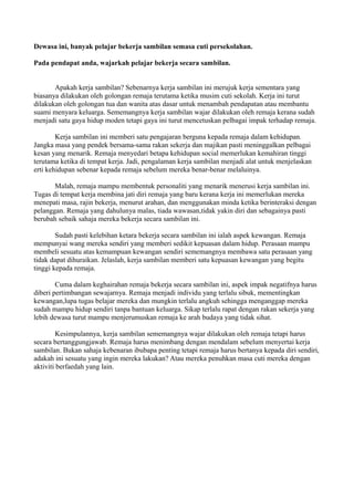Kemalangan jalan raya di negara ini semakin meningkat disebabkan kecuaian pengguna seperti memandu dalam keadaan letih, melebihi had laju, dan menggunakan telefon bimbit. Pihak kerajaan, swasta, dan masyarakat perlu bekerjasama untuk menegakkan disiplin dan keselamatan di jalan raya dengan pelaksanaan undang-undang, kempen kesedaran, dan pemantauan. Selain itu, pelajar juga mulai terlibat dalam pekerjaan sambilan yang memberi pengalaman berguna tetapi perlu dilakukan secara bertanggungjawab.