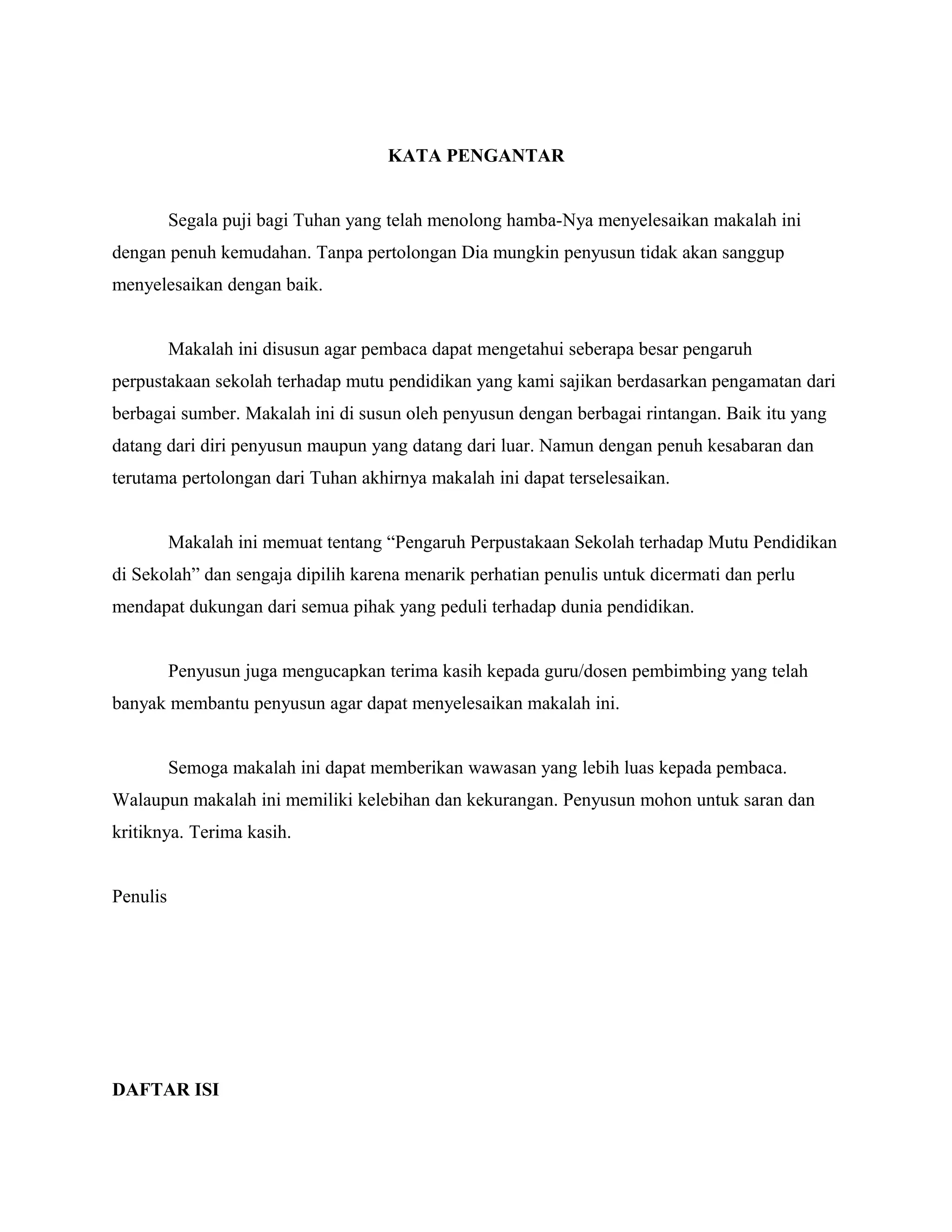 Makalah ini membahas pengaruh perpustakaan sekolah terhadap mutu pendidikan, dengan fokus pada peran dan kontribusi perpustakaan dalam mendukung program pendidikan. Perpustakaan dianggap vital dalam memperkuat kualitas pendidikan melalui berbagai fungsi, seperti edukatif, informatif, dan rekreatif. Ditekankan pentingnya pengelolaan perpustakaan yang profesional untuk mencapai tujuan pendidikan yang lebih baik.