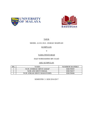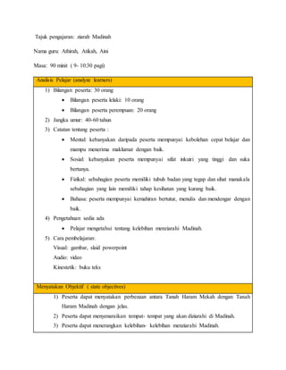 Dokumen ini membahas mengenai pengajaran tajuk ziarah Madinah untuk 30 peserta dengan analisis terhadap kebolehan mental, sosial, fizikal, dan bahasa mereka. Metodologi yang digunakan termasuk syarahan dan soal jawab dengan bahan bantu seperti slaid PowerPoint, video, dan buku teks untuk meningkatkan pemahaman peserta. Penilaian dilakukan untuk menilai pencapaian peserta dan keberkesanan media yang digunakan dalam proses pengajaran.