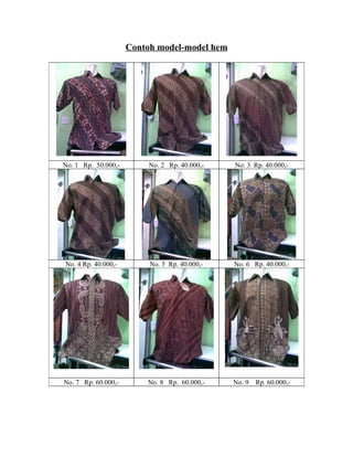This document lists 9 different models with their prices. The first model costs Rp. 50,000 while models 2-6 each cost Rp. 40,000. Models 7-9 each have a higher price of Rp. 60,000.