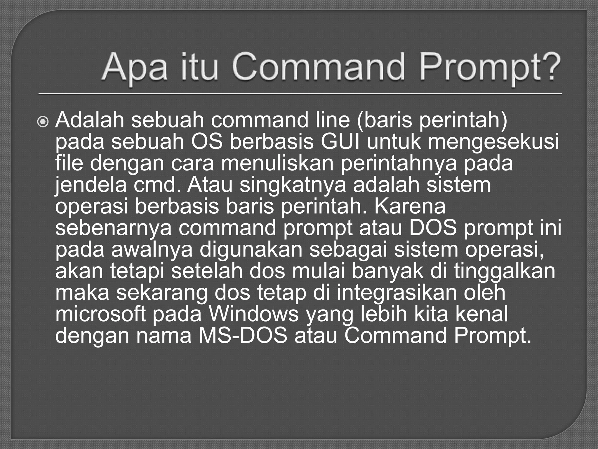 Command prompt merupakan antarmuka baris perintah pada sistem operasi berbasis GUI seperti Windows untuk mengeksekusi perintah secara cepat. Ia digunakan untuk menangani masalah saat GUI bermasalah, seperti virus, dan membiasakan penggunaan command line agar terampil menggunakan server berbasis teks.