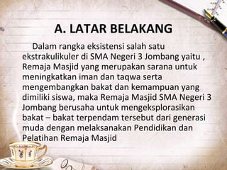 Proposal ini mengusulkan pendidikan dan pelatihan ekstrakurikuler untuk remaja masjid di SMA Negeri 3 Jombang guna meningkatkan iman dan kemampuan siswa dalam bidang agama Islam. Kegiatan akan diadakan pada tanggal 22-23 September 2012 dengan berbagai materi dan pembicara, melibatkan siswa dan alumni. Anggaran dana total sebesar Rp 945.500 akan digunakan untuk biaya konsumsi dan insentif pemateri.