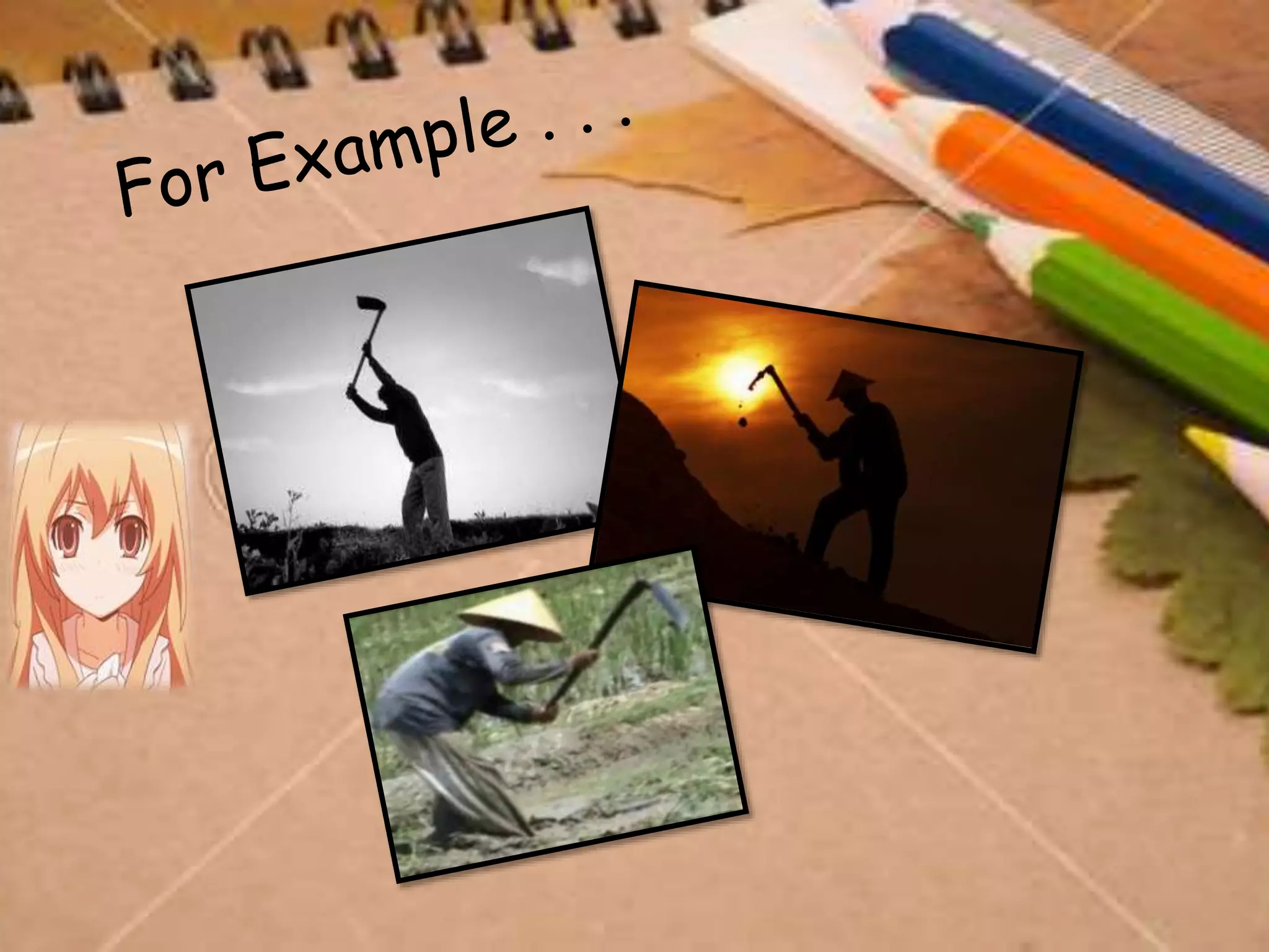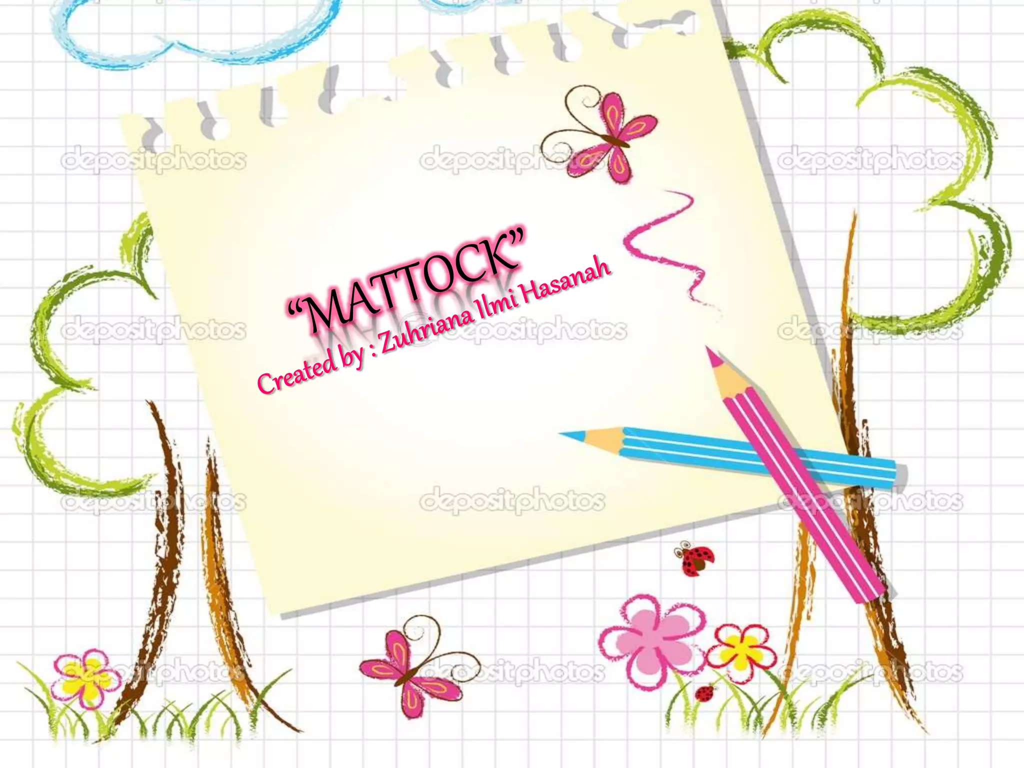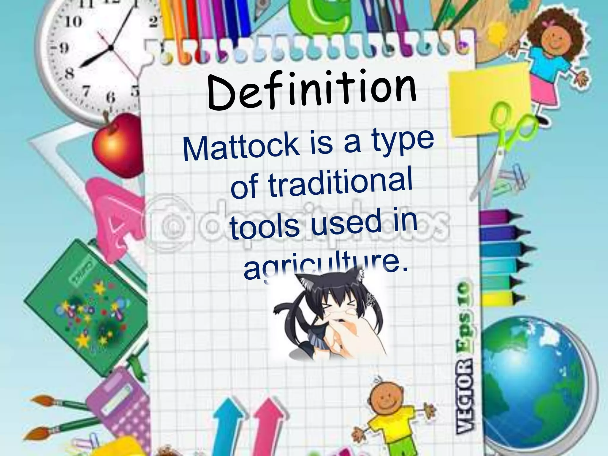 The mattock is a tool used by farmers for digging soil. It has a long oval wooden handle and a flat rectangular iron head. Farmers hold the mattock tightly and use their body as a fulcrum to lift and throw the head into the ground, pulling it back to dig and loosen the soil in paddy fields. The mattock is an important tool for farmers to work the land.