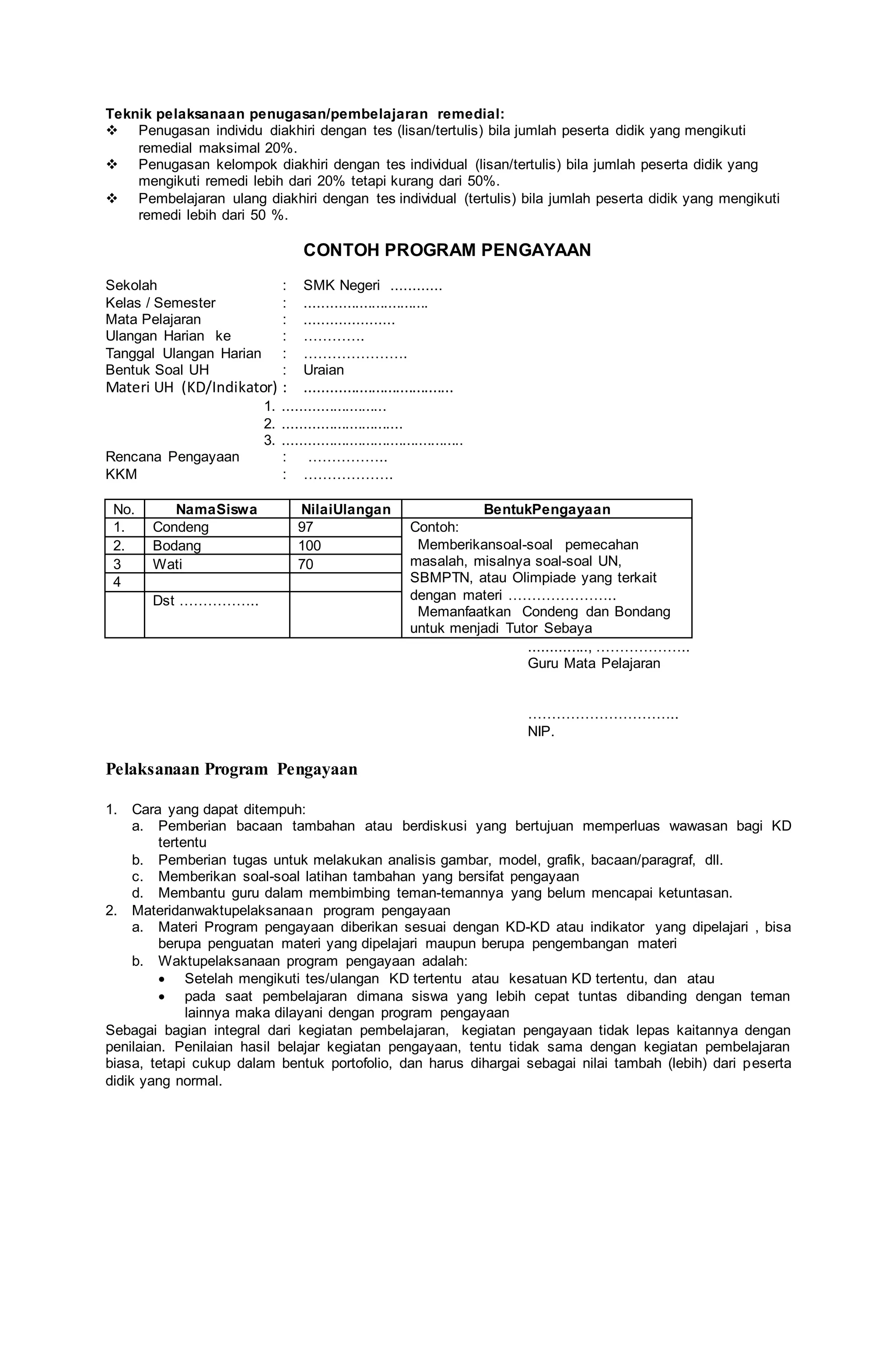 Dokumen tersebut memberikan contoh program remidial dan program pengayaan untuk siswa yang kesulitan memahami materi pelajaran dan siswa yang cepat memahami materi. Program remidial berupa bimbingan individu dan tugas khusus untuk meningkatkan pemahaman, diikuti tes untuk menentukan tuntas atau tidak. Program pengayaan berupa soal-soal tambahan dan membantu teman untuk mengembangkan pemahaman di luar materi pelajaran. Kedua program bert