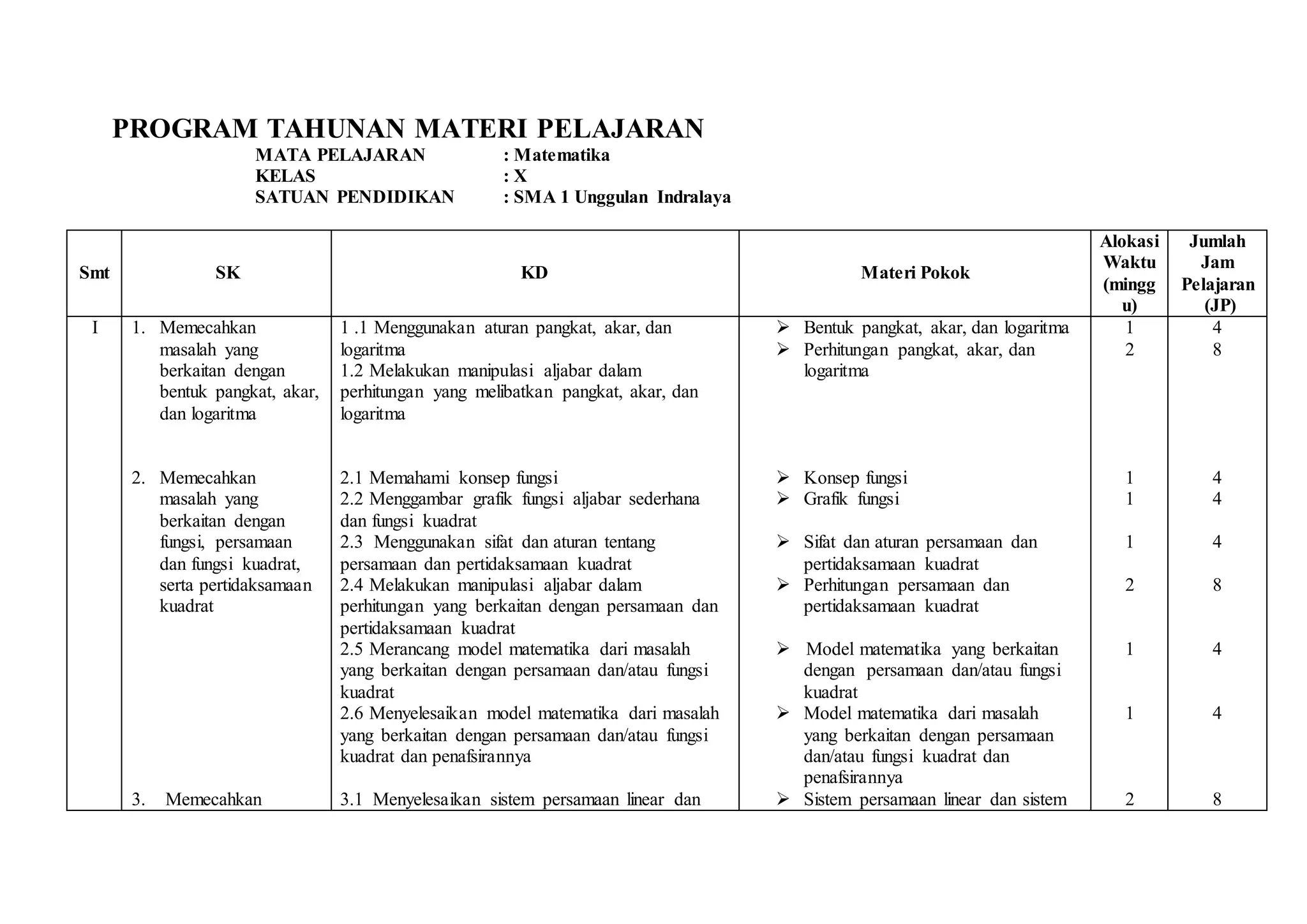 Program tahunan mata pelajaran matematika kelas X SMA 1 Unggulan Indralaya mencakup 6 standar kompetensi yang akan diajarkan sepanjang tahun ajaran, yaitu: 1) bentuk pangkat, akar, dan logaritma, 2) fungsi, persamaan dan fungsi kuadrat, 3) sistem persamaan linear dan pertidaksamaan satu variabel, 4) logika matematika, 5) perbandingan, fungsi, persamaan, dan identitas trigonometri, serta 6