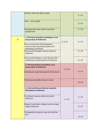 Program tahunan kurikulum 2013 mata pelajaran sejarah kelas X SMA Negeri menjelaskan kompetensi dasar dan alokasi waktu mengajar untuk semester I dan II. Semester I membahas pengertian sejarah, masyarakat pra dan masa aksara, serta dasar-dasar penelitian sejarah. Semester II merekonstruksi kehidupan awal masyarakat Indonesia dan peradaban kuno, serta asal usul manusia di kepulauan Indonesia.