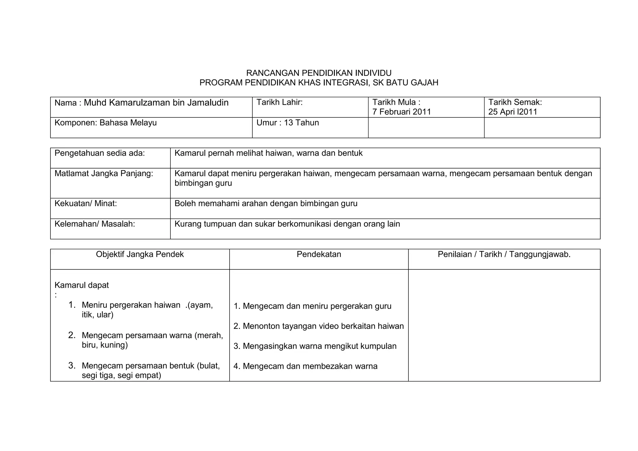 Dokumen ini adalah rancangan pendidikan individu untuk pelajar program pendidikan khas integrasi di SK Batu Gajah, termasuk Muhd Kamarulzaman, Ainul Insyirah dan Muhd Iman Farhin. Setiap pelajar mempunyai matlamat jangka panjang dan objektif jangka pendek yang berkaitan dengan pengenalan haiwan, warna, dan bentuk. Rancangan ini juga mencatat kekuatan, kelemahan, dan pendekatan pembelajaran yang akan digunakan untuk membantu mereka mencapai matlamat tersebut.