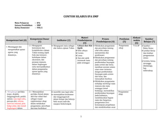 Mata merupakan alat indera yang kompleks dan indah ciptaan Tuhan. Dokumen ini berisi contoh silabus dan RPP mengenai pembelajaran tentang mata sebagai alat optik dan indera penglihatan manusia. Pembelajaran dirancang untuk memberikan pemahaman tentang proses pembentukan bayangan di mata manusia dan serangga melalui observasi model mata dan eksperimen sederhana. Siswa diajak mengagumi ciptaan Tuhan serta belajar secara il