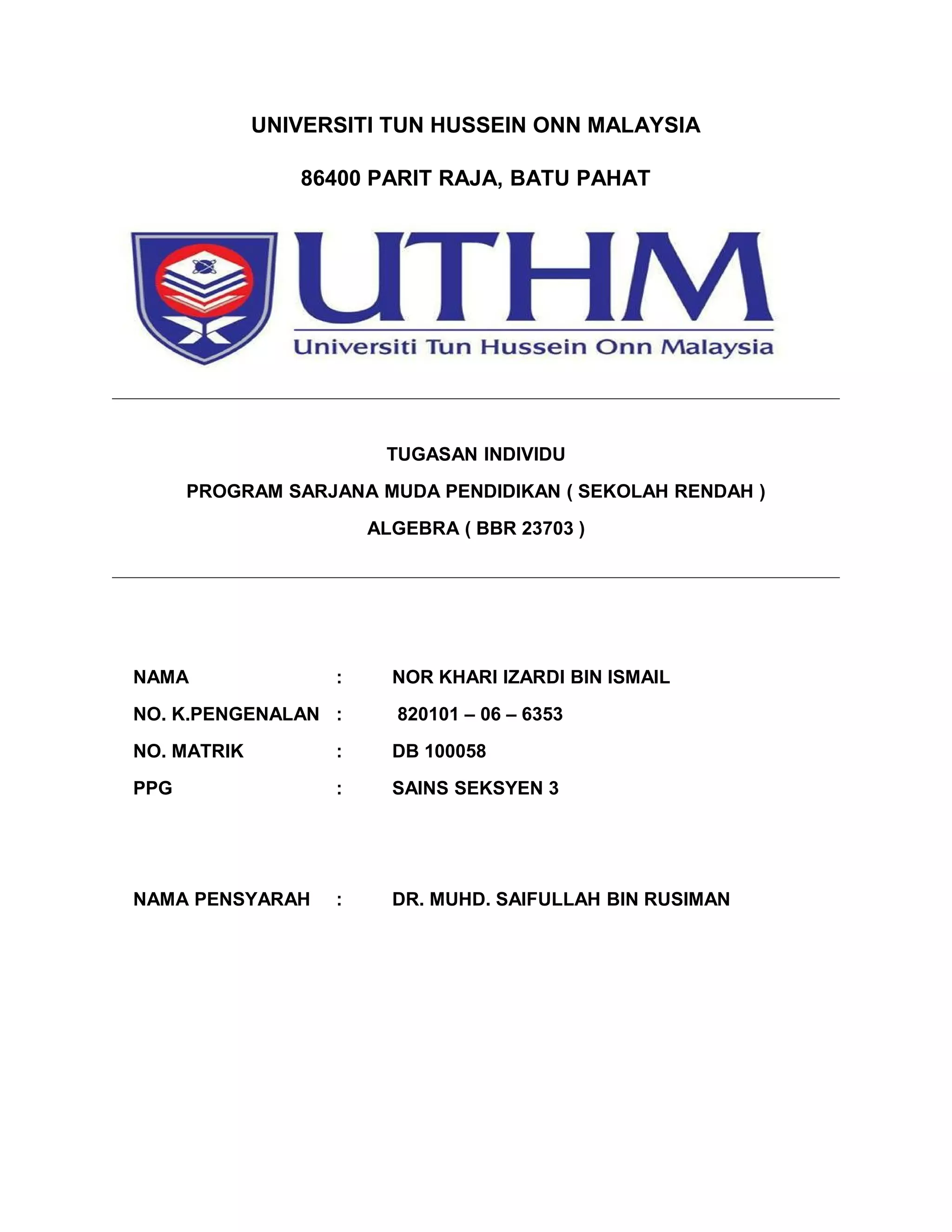 This document contains an individual assignment for an Algebra course at Universiti Tun Hussein Onn Malaysia. The assignment includes two questions. Question 1 has parts (a) and (b) that involve solving equations using completing the squares and the quadratic formula. Question 2 asks the student to show that -1 is a root of the given equation and then factorize it completely. It also asks the student to calculate the composition of some given functions.
