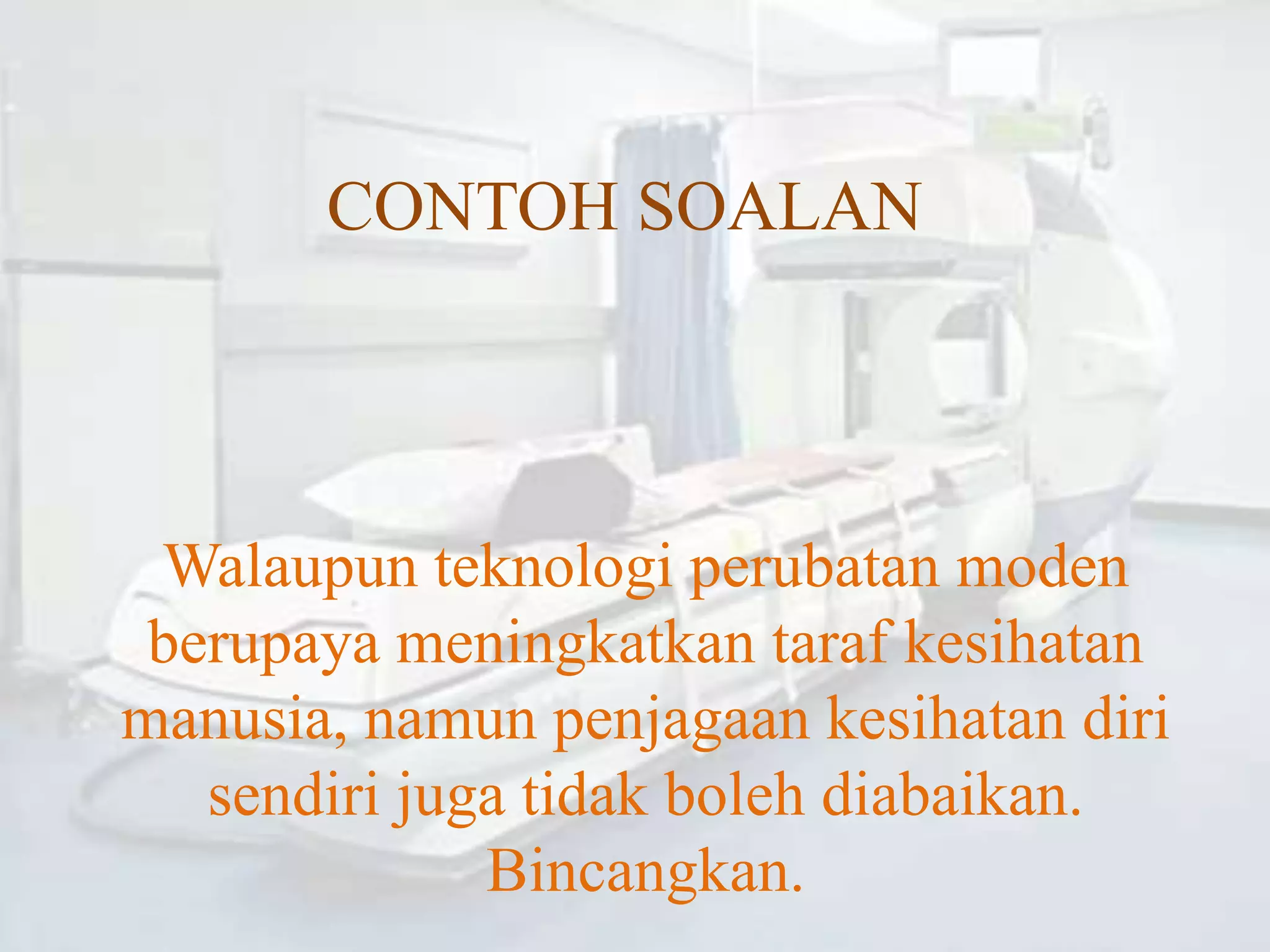 Walaupun teknologi perubatan moden meningkatkan kesihatan manusia, penjagaan kesihatan diri tetap penting. Teknologi seperti pembedahan laser dan pengesanan awal penyakit memudahkan rawatan, tetapi pemakanan seimbang dan gaya hidup sihat juga diperlukan untuk mencegah penyakit. Kesihatan yang baik terbentuk melalui gabungan teknologi dan usaha individu dalam pencegahan.