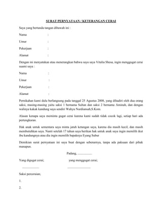 Dokumen pertama berisi pernyataan kesanggupan seseorang bernama Wahyu Nurdiansah untuk bekerja sebagai staff manajemen di suatu perusahaan, meninggalkan pekerjaan sebelumnya. Dokumen kedua berisi pernyataan cerai seseorang bernama Vitalia Shesa dari suaminya dengan alasan tidak cocok lagi. Dokumen ketiga berisi pernyataan kehilangan KTP oleh Wahyu Nurdiansah.