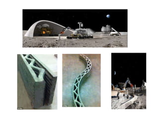 Contour crafting is a 3D printing technique for constructing houses and structures layer by layer under computer control. It was developed by Professor Behrokh Khoshnevis at the University of Southern California to provide quick, affordable housing. The contour crafting machine can build a 2000 square foot house in 24 hours, including plumbing and electrical systems. NASA has proposed using this technique to construct habitats for astronauts on the Moon and Mars. Contour crafting produces houses and structures much faster and more affordably than traditional construction methods, with less waste, making it useful for low-income housing and emergency shelter as well as complex architectural designs.