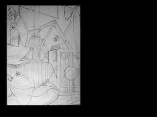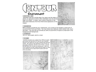 The document discusses contour drawing and how line weight is used to define shape, form, and details without using shading. Contour drawings use lines of varying thickness to describe surfaces, shadows, textures, and suggest three-dimensional form. Artists can create darker or lighter lines by pressing harder or softer with the pencil to depict areas that would be in shadow or light.