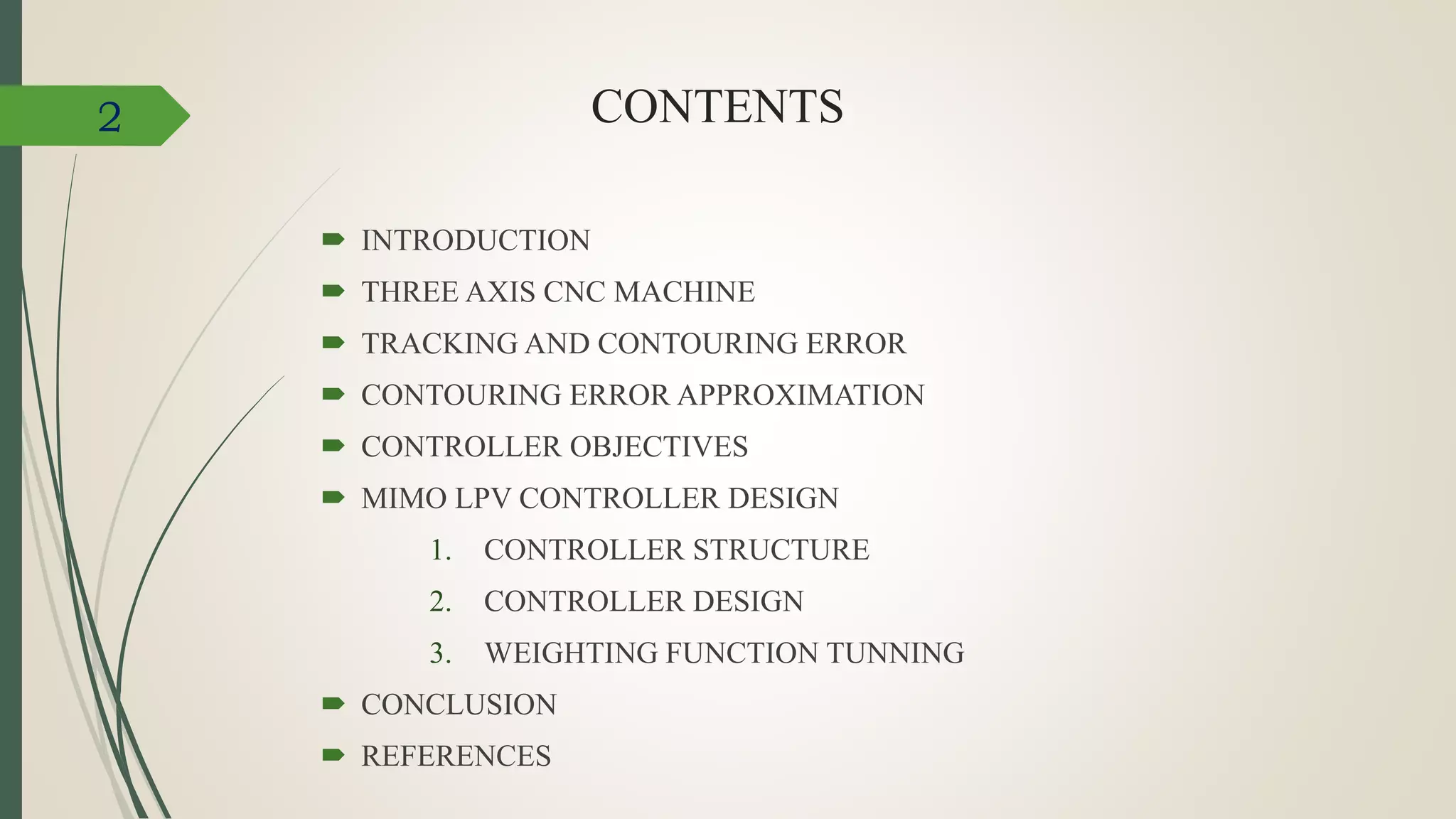 This document describes a contouring control method for CNC machine tools using a linear parameter-varying (LPV) controller. It involves transforming the axis coordinates into a task frame defined by the toolpath direction and velocity. An LPV feedback controller is designed as a function of the toolpath trajectory direction and velocity to minimize estimated contouring error while suppressing vibration. Weighting functions in the controller design are tuned to improve contouring accuracy and bandwidth by adjusting parameters like gains and crossover frequencies.