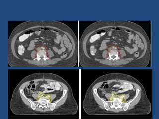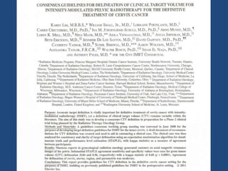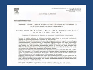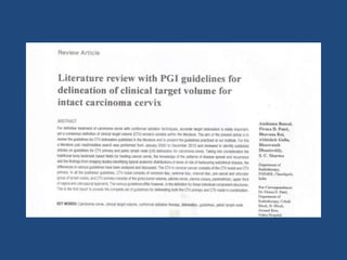 The document provides guidelines for contouring the clinical target volume (CTV) and organs at risk for carcinoma of the cervix treated with 3D conformal radiation therapy or intensity-modulated radiation therapy. The CTV includes the involved lymph nodes (GTV N) and relevant draining nodal groups. The CTV for the primary tumor (CTV-P) includes the gross tumor, uterus, cervix, parametrium, vagina, and ovaries. Detailed guidelines are provided for contouring the lymph node regions, uterus, vagina, and parametrium. A planning target volume (PTV) is created by adding a 10 mm margin to the total CTV. Additional margins are used to create an