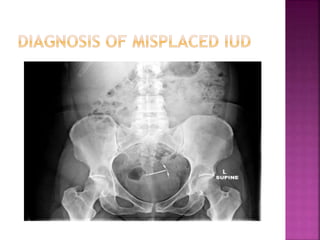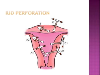 The document provides a comprehensive overview of intrauterine devices (IUDs), including their types, mechanisms of action, insertion procedures, contraindications, and complications. It outlines the differences between copper and hormonal IUDs, their benefits, non-contraceptive uses, and potential side effects. Additionally, the document discusses guidelines for insertion timing, removal, and follow-up care, emphasizing the safety and effectiveness of IUDs as a contraceptive method.