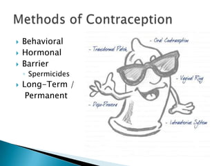 The document discusses various methods of contraception including behavioral methods like abstinence and withdrawal, as well as barrier methods like condoms and diaphrams. It also covers long-term hormonal methods like implants, IUDs, shots and pills. For each method it describes what it is, how it works, effectiveness rates and access. Permanent sterilization procedures for men and women are also outlined.
