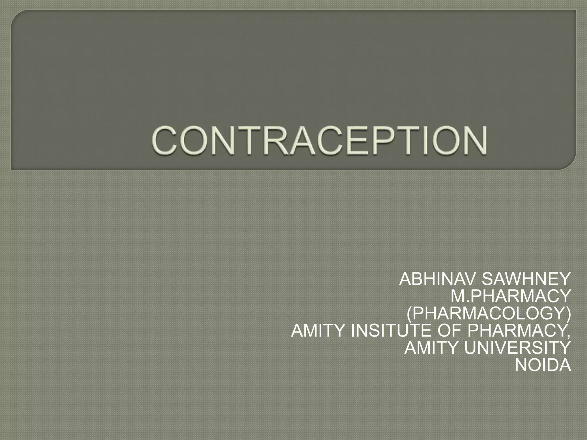 This document discusses various methods of contraception, including hormonal methods like oral contraceptives, barrier methods, intrauterine devices, and surgical methods like tubal ligation and vasectomy. It provides details on the mechanisms of action, effectiveness, advantages, and disadvantages of different contraceptive options to help health care providers choose appropriate contraception based on individual clinical situations.