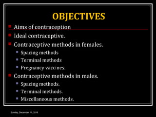 This document discusses various contraceptive methods for both females and males. It begins by listing the objectives of contraception and characteristics of an ideal contraceptive. It then covers spacing and terminal contraceptive methods for females, including barrier methods, chemical methods like oral contraceptive pills and injectables, and intrauterine devices. It also discusses medical termination of pregnancy. The document concludes by summarizing spacing and terminal methods for males, such as condoms, male pills, and hormonal preparations.