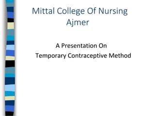 This document provides an overview of different temporary contraceptive methods, including barrier methods like condoms and diaphragms, hormonal methods like oral contraceptives and injectables, and intrauterine devices. It describes the effectiveness, side effects, and proper use of each method. The ideal contraceptive is described as highly effective, safe, simple to use, and reversible. The conclusion emphasizes that providing a variety of contraceptive options can help couples plan their families by avoiding unwanted pregnancies.