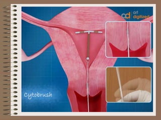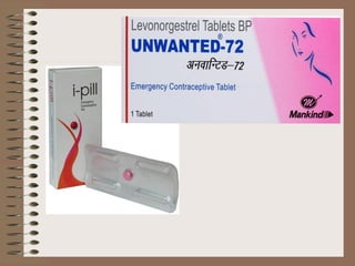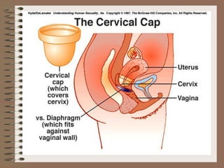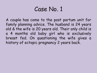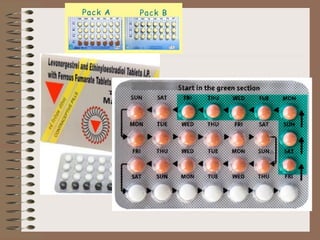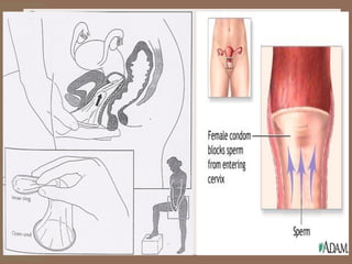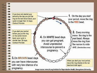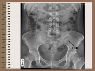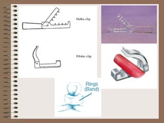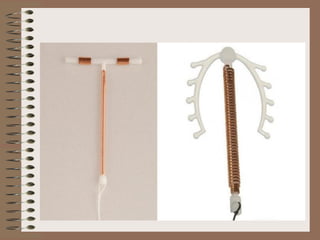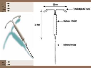 The document discusses various contraceptive methods including natural methods, barrier methods, intrauterine devices (IUDs), and hormonal contraceptives. It provides details on different types of IUDs including 1st, 2nd, and 3rd generation IUDs. It describes the mechanisms of action, effectiveness, advantages, and disadvantages of natural family planning methods, barrier methods like condoms and diaphragms, and IUDs. The document also discusses eligibility criteria and insertion techniques for IUDs.