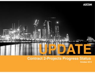 This document provides a summary of the progress status of Contract 2 projects in October 2013. It includes information on planned and actual dates for various milestones, percentage of completion, and a schedule dashboard for one project (QS004 - Roads and Infrastructure in Wadi Aba Seleel). The dashboard shows the planned and actual dates for initiation, concept design, preliminary design, detailed design/tender documents, tendering, construction and maintenance periods, as well as percentage progress and schedule performance index. An activity schedule is also included for QS004, listing the activities, planned and actual start/finish dates, and percentage complete.