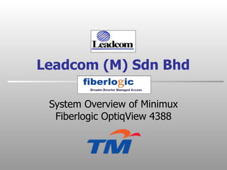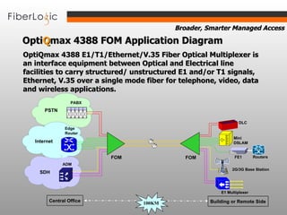 The OptiQmax 4388 is a fiber optic multiplexer that carries E1, T1, Ethernet and V.35 signals over single mode fiber. It has hot-swappable modules, 1+1 optical protection switching, and provides transmission up to 100km. It also monitors performance parameters and provides alarms.