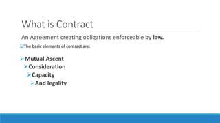 The document provides an overview of contract law, defining contracts as enforceable agreements that require mutual assent, consideration, capacity, and legality. It discusses the principles of contract enforceability, remedies for breach of contract, and the role of commercial impracticability, including securities like performance and payment bonds. Additionally, the text emphasizes the importance of interpretation in contracts and mentions various legal resources and references.
