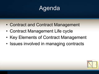 This document discusses contract management. It defines a contract and contract management, and outlines the key elements and lifecycle of effective contract management. These include planning, performance monitoring, relationship management, governance, knowledge management, change management, contingency planning, and ongoing review. Issues at each stage of the contract management lifecycle are also examined, from procurement to closure. The document emphasizes that contract management aims to ensure all parties fully meet obligations to satisfy operational objectives and strategic goals.