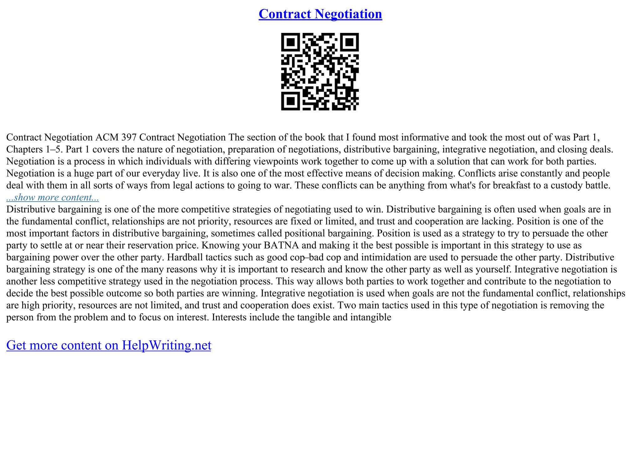 The document discusses key elements of contract formation and negotiation strategies. It covers the nature of negotiation, preparation, distributive bargaining, integrative negotiation, and closing deals. Distributive bargaining is a competitive strategy used when goals conflict and trust is low, using tactics like establishing a strong bargaining position. Integrative negotiation is less competitive and allows parties to find mutually beneficial solutions by addressing underlying interests rather than positions.
